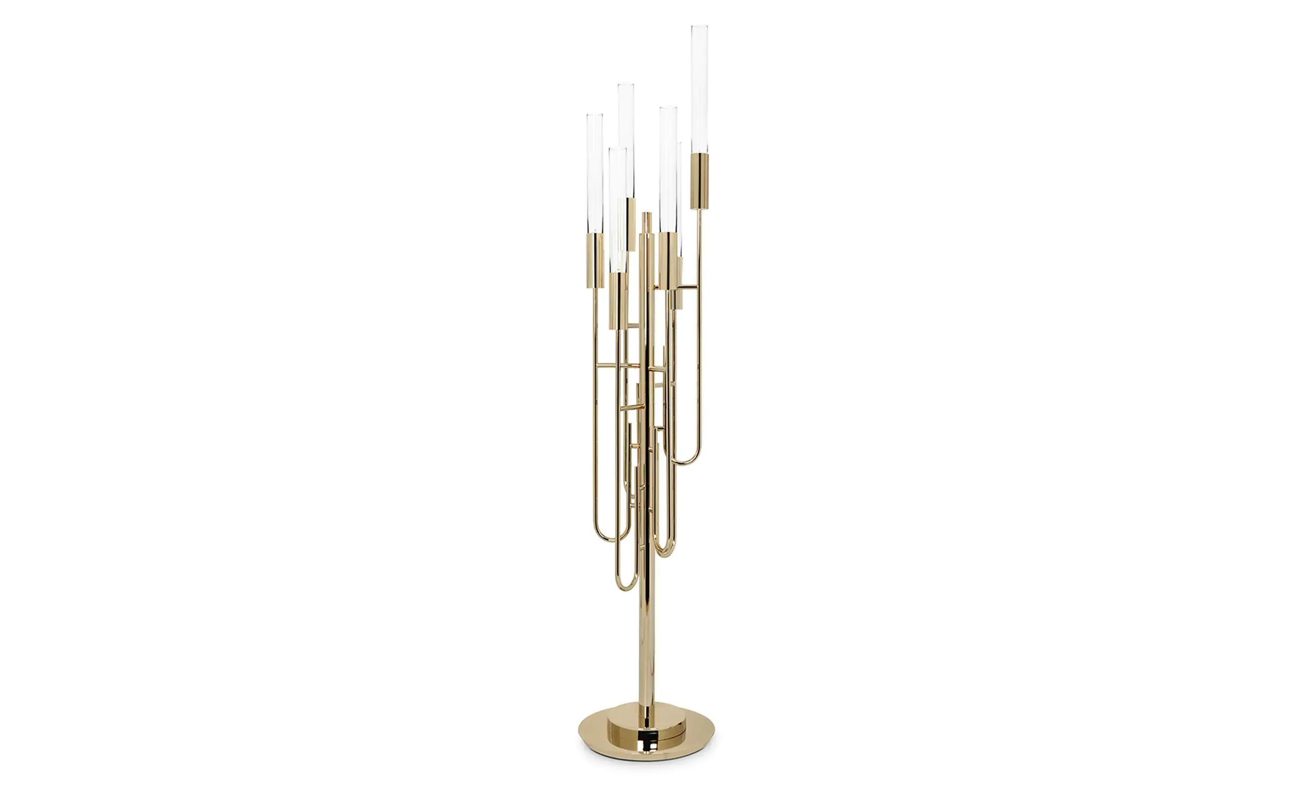 Discover our unique Gala floor lamp elegantly made of gold plated brass and crystal glass. Our splendid floor lamp gets its inspiration in cheerful moments and intense design. It is the ideal contemporaneous shape to take a step further in interior design. This masterpiece is the touch of luxury needed to create a prestigious ambiance whether it is exposed in a lounge or a hallway.